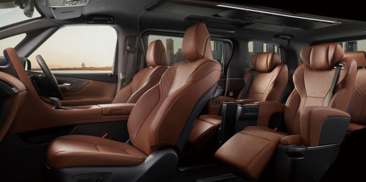 內飾只有黑棕兩種配色,儀表盤換成大屏了,12.3英寸液晶顯示器。座椅是真皮材質,第二排裝了航空座,能調節角度還能加熱通風。不過這些功能在國內同價位的商務車里都算基本配置了。