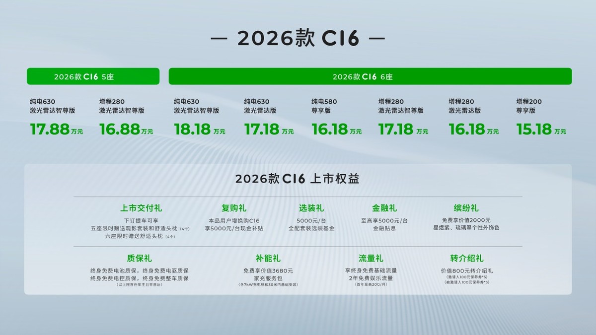 零跑C16作為零跑品牌的主銷車型,定位于15~20萬元市場,憑借不俗的產品力和務實的定價,成為所在細分市場的主流車型。為了進一步提升競爭力,2026款零跑C16于6月18日正式上市,官方售價15.18萬-18.18萬元,提供五座和六座兩種座椅布局車型。同時,為了進一步提升競爭力,新車還送出包括終身質保、5000元置換補貼在內的購車權益。
