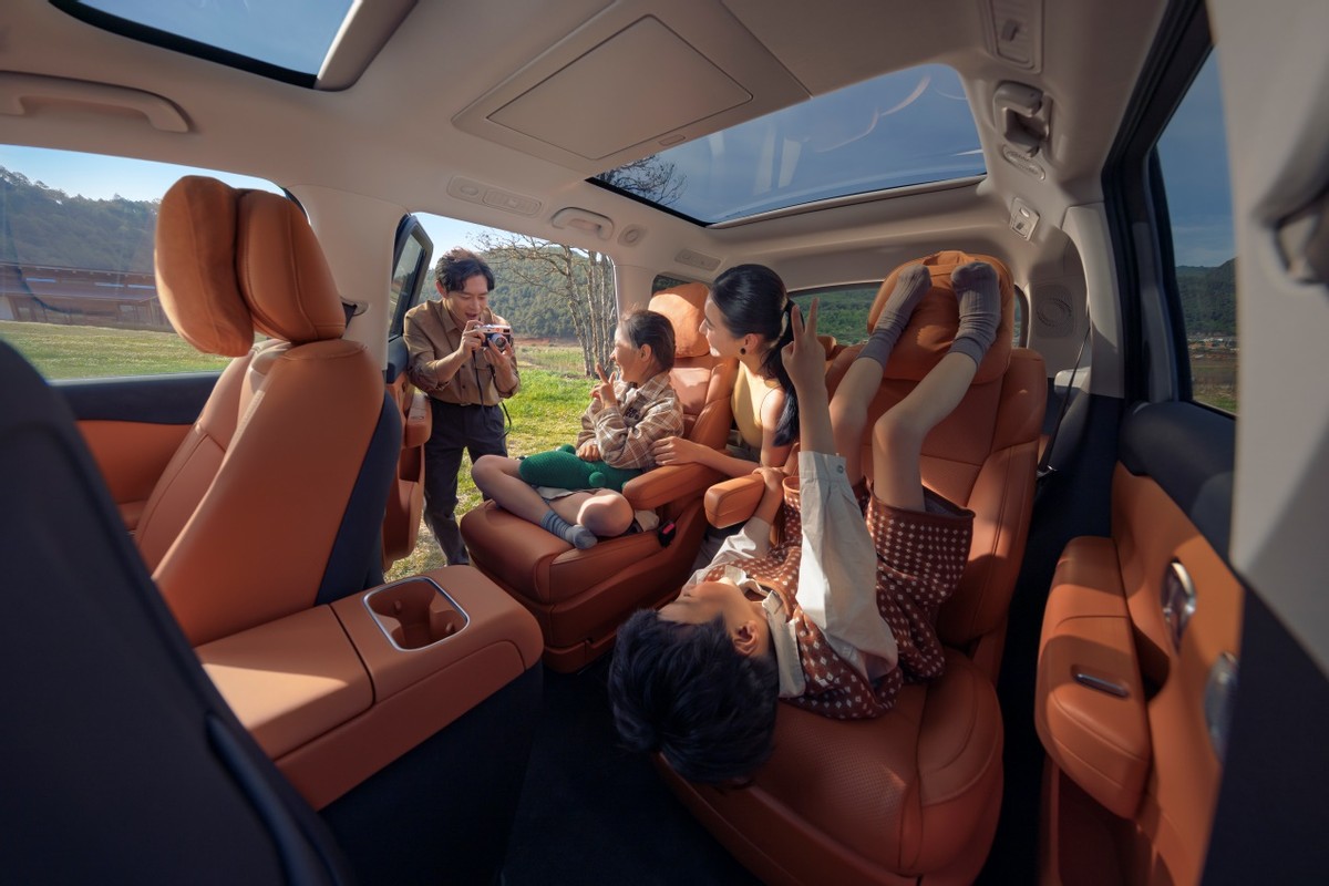 六座版車型方面,新車第二排升級為雙側滑座椅,可實現“一鍵貼貼”及“一鍵優雅上下車”,并擁有145°超大靠背調節角度和座椅按摩功能。同時,新車還配備8.1L直筒式冷暖冰箱。三排座椅采用“劇院式”階梯布局,對腿部和頭部空間進一步優化,徹底告別“三排小板凳”。